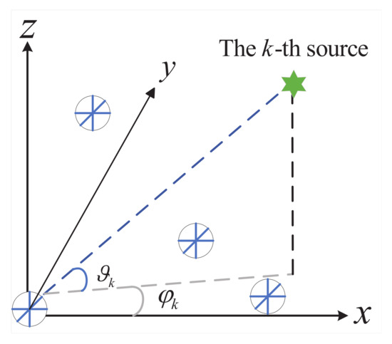 Electromagnetic waves, as transverse waves, have electric and magnetic field components that are mutually orthogonal and oscillate at the same frequency. This characteristic enables the polarization phenomenon of electromagnetic waves to be characterized by changes in the direction of the field vectors. Polarization-sensitive arrays, which respond differently to electromagnetic waves with different polarization states, provide an additional dimension for signal feature extraction. Electromagnetic vector sensors (EMVSs) are a type of polarization-sensitive array element. They feature a co-located structure that combines three mutually orthogonal electric dipoles and three orthogonal magnetic loops. This distinctive configuration allows them to simultaneously measure all six components of electromagnetic fields, specifically three electric field components and three magnetic field components. For K incident completely polarized transverse electromagnetic (TEM) plane waves, the ideal (noise-free) output of the EMVS corresponds to the k-th wave (), and its polarization characteristics are captured by the response vector [27]: