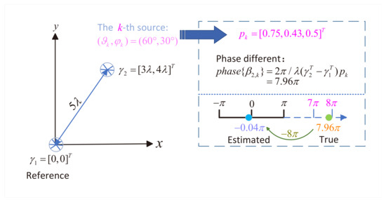 where and each represents the k-th eigenvalue extracted from the diagonal matrix . The relationship in Equation (56) becomes invalid when due to the -periodicity of . This periodicity induces phase ambiguity, as demonstrated by a two-EMVS array in the Cartesian coordinate plane, as illustrated in Figure 2. For a source at with true , the phase difference becomes wrapped to after modulo- reduction. However, the exponential mapping function would map it to by subtracting ; namely, the estimated phase difference is . To accurately fit the directional cosine waveform, we need to determine the true phase difference first. According to the exponential mapping property, we modify Equation (56) to explicitly account for phase periodicity: