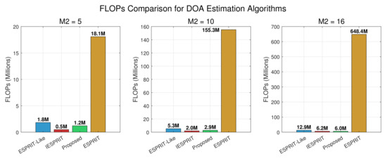 Experiment 1: With the parameters set as , , , and , we investigate the computational complexity (in terms of FLOPs) of the considered algorithms under different array configurations. The comparison results are depicted in Figure 5. When and , the proposed PM-based approach consistently ranks second in terms of computational load, slightly higher than IESPRIT but lower than ESPRIT and ESPRIT-like. However, as the array size increases, the trend shifts: at , the computational advantage of the PM algorithm becomes evident, enabling it to achieve the lowest FLOPs among all methods. This outcome highlights the scalability of the proposed method, indicating that its efficiency gains are more pronounced for larger array configurations.