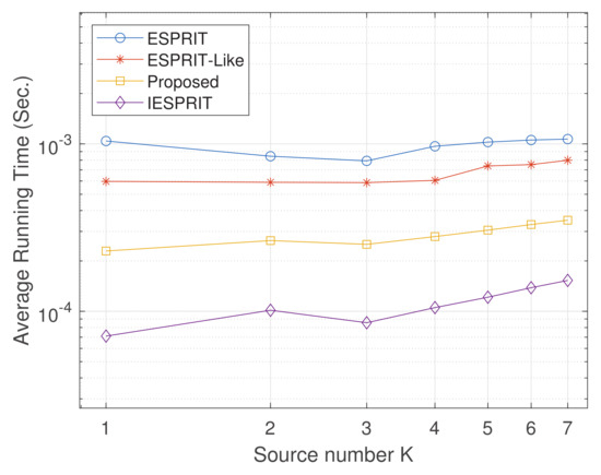 Experiment 2: With parameters set as , , , and (where denotes the spacing between array elements along the x-axis and denotes the spacing along the y-axis), we conducted 1000 Monte Carlo trials (item = 1000) to analyze the relationship between the average running time (AVT) and the number of sources K; results are illustrated in Figure 6. It is evident that the AVT of all algorithms remains relatively stable as K accumulates, with minimal fluctuations. Compared with classical ESPRIT and ESPRIT-like algorithms, both IESPRIT and the proposed method exhibit superior efficiency, attributed to optimized computational strategies. As shown in the figure, IESPRIT achieves the lowest average running time across all K values, while the proposed method outperforms ESPRIT and ESPRIT-like, particularly for . This improvement underscores the effectiveness of the enhanced algorithms in reducing computational complexity. Although IESPRIT achieves the lowest average running time, the proposed method still shows clear improvements over ESPRIT and ESPRIT-like by avoiding eigenvalue decomposition. This indicates that our method is efficient, though not the absolute minimum in runtime.
