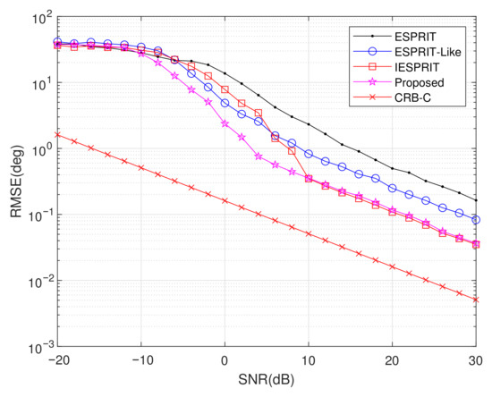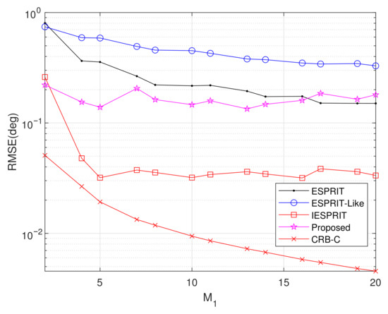 Experiment 5: Setting , , , , SNR = 10 dB, and item = 500, Figure 9 illustrates the average RMSE variation versus . The CRB exhibits a monotonic decrease with increasing values, and both IESPRIT and the proposed method maintain performance advantages across the tested range. However, while the proposed algorithm demonstrates superior estimation accuracy when , ESPRIT achieves lower RMSE values for .