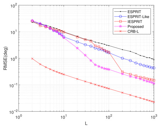 Experiment 4: Setting , , , SNR = 10 dB, and item = 500, we evaluated the average RMSE performance as a function of sample size L, with results depicted in Figure 8. The plot reveals that all investigated algorithms achieve progressively lower RMSE values with increasing L. Throughout the tested range, the proposed methodology consistently surpasses alternative techniques in estimation accuracy. Particularly for , the proposed approach demonstrates substantial performance advantages, with its RMSE approaching the CRB as the number of snapshots increases. In contrast, competing methods exhibit a larger gap with this theoretical bound, indicating that the proposed technique provides improved effectiveness and robustness in delivering precise DOA estimates.