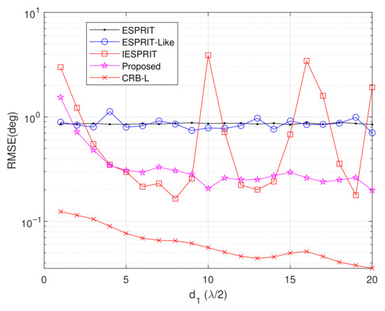Experiment 6: Setting , , , SNR = 10 dB, and item = 500, Figure 10 presents the average RMSE versus inter-element spacing . This investigation focuses on element spacing variation in the L-shaped array configuration while maintaining fixed coprime array sensor positions. The results reveal a significant RMSE improvement for the proposed method with increasing values. However, beyond , additional spacing increments yield diminishing returns in estimation accuracy, indicating performance stabilization. When , the array aperture exceeds the Rayleigh distance, and wavefront curvature effects are introduced. This phenomenon violates the plane wave assumption, thereby limiting further reduction in RMSE. Notably, IESPRIT exhibits sporadic failures at specific spacing values, while the proposed algorithm maintains consistent robustness across all tested conditions. Furthermore, the proposed technique sustains an approximately 10 dB lower RMSE compared to ESPRIT and ESPRIT-like methods throughout the parameter range, demonstrating superior estimation accuracy and operational reliability.