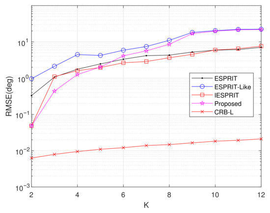 Experiment 7: Setting , , , , SNR = 20 dB, and item = 500, this experiment investigates the influence of source count K on average RMSE performance, as illustrated in Figure 11. Results indicate a significant reduction in RMSE across all algorithms with increasing source count. For , the proposed method demonstrates significantly higher accuracy in comparison with benchmark algorithms. The performance advantage gradually diminishes when , though our method remains dominant. At higher source counts (), while both IESPRIT and ESPRIT eventually surpass the proposed method, it consistently maintains a lower RMSE than ESPRIT-like methods.