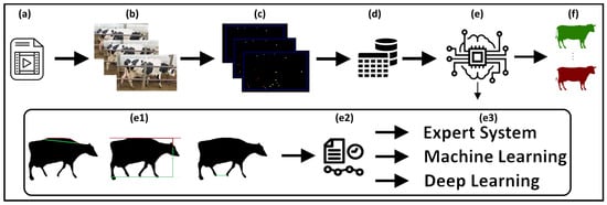 A streamlined pipeline for detecting cow lameness through video analysis. Our solution processes directly from video input to the final lameness-detection decision, embodying an end-to-end system. The process initiates with the capture and input of video into the system (a), followed by the separation of the video into individual frames (b). Computer vision algorithms are then employed to detect the cow and annotate anatomical landmarks within each frame (c). These landmarks and the bounding box data are subsequently stored (d). Base algorithms are applied, analyzing the curvature of the spine (e1—left), the relative position of the head to the legs and spine (e1—center), and the distances between legs on the same side (e1—right) for each frame. Finally, the data iare either aggregated or analyzed as a time series (e2), utilizing various final decision algorithms (e3) to thoroughly evaluate the cow’s health, categorizing it as healthy or lame, or rating it on a 1–7 scale (f).