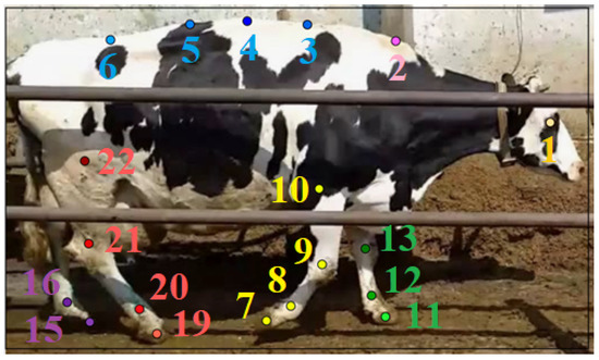 Annotated cow with bounding box and 22 key anatomical points for lameness detection. “FR” denotes Front Right, “FL” Front Left, “BR” Back Right, and “BL” Back Left, indicating specific limbs for precise tagging and analysis. Points are tagged as follows: 1—Eye, 2—Neck, 3—Spine_1, 4—Spine_2, 5—Spine_3, 6—Spine_4, 7—FR_Hoof, 8—FR_Fetlock, 9—FR_Carpal, 10—FR_Elbow, 11—FL_Hoof, 12—FL_Fetlock, 13—FL_Carpal, 14—FL_Elbow, 15—BL_Hoof, 16—BL_Fetlock, 17—BL_Ankle, 18—BL_Knee, 19—BR_Hoof, 20—BR_Fetlock, 21—BR_Ankle, and 22—BR_Knee. Points that were not visible were not tagged—as here 14, 17, 18.