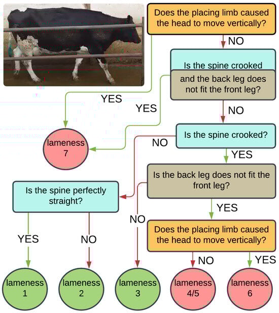 The rule-based expert system diagram is displayed in Figure 3. To classify cow lameness into two ranges at different division levels using different algorithms, we utilized an expert system based on a decision tree. The algorithm divides the degree of lameness based on the animal’s various characteristics. During the first stage, cows are categorized into two groups based on their lameness level: those with a level of 1–6 and those with a level of 7. A head algorithm determines this categorization. If a cow is classified into groups 1–6, the spine and legs algorithm’s curvature is used to verify this value. The lameness is then divided into two groups: 1–2 and 3–6, according to the spine algorithm. The same algorithm is used to classify the cow on a scale of 1 or 2. The division of lameness into stages 3 versus 4–6 is determined by the legs algorithm, while the head algorithm determines the division of 4–5 versus 6. Cows with stages 4–5 of lameness are grouped together due to slight differences between these stages of the disease. The divisions were determined by the thresholds assigned with collaborations with vet experts to each algorithm and the level to divide.