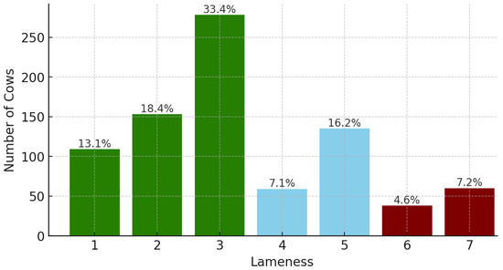 Lameness is a serious welfare concern in all types of farms, although its economic and management impact is most evident in large-scale operations, where it contributes to significant losses and increased culling and replacement rates [1]. A recent extensive review [2] reported that the average prevalence of dairy cows’ lameness across various global studies was found to be 22.8%, with reported prevalence values ranging from 5.1% to 45%. Due to its adverse impact, farmers and researchers have shown a keen interest in developing indicators to identify lame animals immediately and assess the severity of the condition.