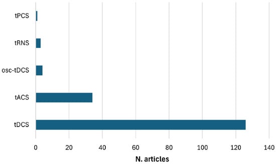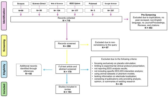 The present study was conducted in accordance with the PRISMA guidelines [13], incorporating the recommendations outlined in Kitchenham’s guide [14]. A flow diagram of the database search process is presented in Figure 1, outlining the phases of identification, screening, eligibility, and inclusion. No review protocol was registered for this systematic review. Articles were collected from the Google Scholar, PubMed, Scopus, IEEEXplore, ScienceDirect, and Web of Sciences databases by using the query “EEG AND (TDCS OR transcranial direct current stimulation OR TACS OR transcranial alternating current stimulation OR TRNS OR transcranial random noise stimulation OR TPCS OR transcranial pulsed current stimulation)”, with a restriction to article title [15]. Data from the included studies were charted using a form developed by the research team and pilot-tested on a sample of five studies to ensure consistency and clarity. Article selection and quality evaluation were conducted by the second and third authors: the second author performed the initial evaluation following the QATQS protocol guidelines, and the third author independently repeated the evaluation. Any discrepancies in data charting or study quality assessment were discussed and resolved through consensus, with the involvement of all authors when necessary to reach convergence. Only peer-reviewed papers published in journals or conference proceedings and written in English were included. No date restrictions were applied, and the literature search was conducted through January 2025. Subsequently, the screening process was carried out by combining the results from each source and excluding all duplicates and citations. Titles were manually screened to exclude papers deemed irrelevant or inconsistent with the query. Finally, during the eligibility phase, all remaining full-text papers and abstracts were screened based on the criteria outlined in the following section. The remaining papers in this final phase were included in the review analysis to address the research questions.