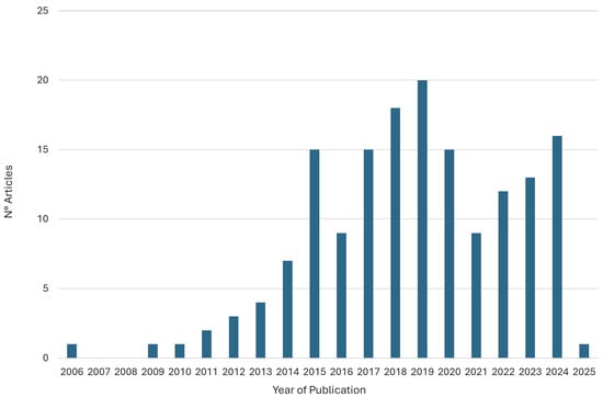 A comprehensive literature search was conducted through Google Scholar, Scopus, PubMed, ScienceDirect, Web of Science, and IEEE Xplore, resulting in the identification of 719 records. Of these, 453 records were excluded due to duplication or non-compliance with the predefined pre-screening criteria. Subsequently, during the screening phase, an additional 87 articles were excluded due to irrelevance to the established search query. Furthermore, 85 articles were removed during the eligibility assessment, as they did not meet the predefined inclusion criteria. Manual screening of reference lists from studies meeting the eligibility criteria ensured more comprehensive coverage of the literature. This approach yielded 60 additional relevant records not captured by the initial database search. Moreover, since the described procedure initially yielded only two contributions relevant to RQ-II, a modified search was conducted to identify additional references [18]. The word loop was added to the previous query, and the search was extended to the abstract and keyword fields. Finally, other types of contributions, such as letters, were also considered. This modified search strategy yielded eight additional references for RQ-II. Overall, 162 studies were ultimately included in the review analysis. The distribution of the selected articles by year of publication is illustrated in Figure 2.