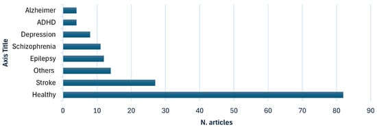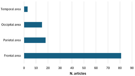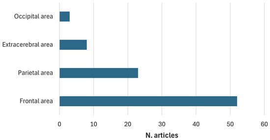 Table 3 presents the 132 studies addressing the third research question—namely, whether the assessment of the treatment outcomes is based on EEG analysis. The table reveals a predominant use of spectral power, particularly in alpha (seventeen articles), theta (fourteen articles), and beta bands (twelve articles), as a neurophysiological feature for assessment of the effects of transcranial stimulation on brain activity. Event-Related Potentials (ERPs) were reported in eleven studies, indicating a frequent use of measures time-locked to cognitive or sensory stimuli. Furthermore, the Event-Related Desynchronization/Synchronization (ERD/ERS) parameters, observed in six and five studies respectively, reflect a less common focus on the dynamic analysis of induced brain activity. Other features, such as the Global/Local Mean Field Power (GMFP/LMFP), connectivity indices (e.g., Phase Locking Value (PLV) and Lagged Phase Synchronization (LPS)), and Approximate Entropy (ApEn), were reported in isolated cases.