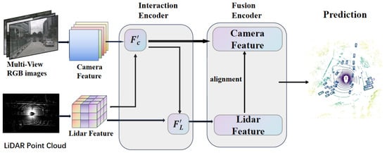 CrossInteraction overall framework: LiDAR feature and camera feature are taken as inputs. Interaction encoder: enhances this information through cross-modal interactions. Fusion encoder: integrates the enhanced features from both modalities before the prediction is completed.