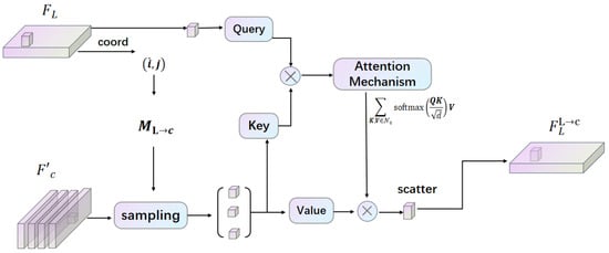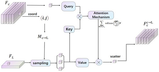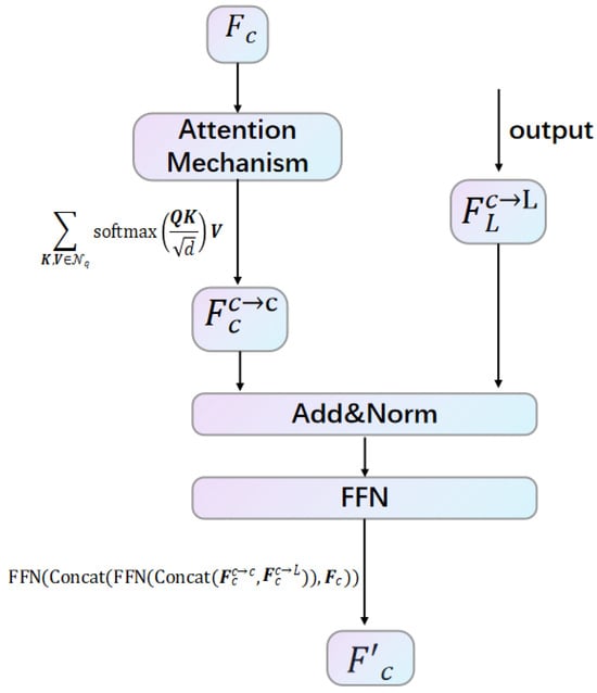 Next, we employ an attention-based feature representation interaction. Each image point is treated as a query , while the cross-modality neighbors act as key K and value V; these are applied to achieve the cross-attention learning work: