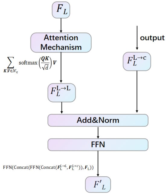 At the same time, we apply the local attention, as described in Equation (1), utilizing a grid neighborhood as the key Q and value V for both modalities. This further facilitates the learning of intra-modal representations. For image feature representation, we denote this process as . Finally, through the representation integration framework, each layer outputs an enhanced image representation, which enriches the overall feature set for subsequent processing tasks.