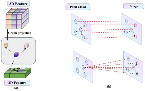 Alignment Framework: (a) shows our alignment framework uses graph-based feature alignment to match more reasonable alignments between modalities. (b) shows two methods we used to project the point cloud features onto the image with one-to-one and one-to-many within alignment process, which can achieve better alignment, in order to achieve better results in the subsequent perception training tasks.
