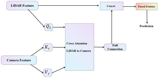 The fusion framework is shown in Figure 7. To effectively integrate features from LiDAR and camera images, we introduce a cross-attention mechanism that enhances the understanding of the interrelationships between these two modalities. In the deep feature fusion step, we first transform each LiDAR feature into a voxel representation containing multiple points, while associating the corresponding camera pixels with a polygonal region. This input data structure comprises a voxel unit and its associated N camera features. We design three fully-connected layers to convert the voxel features into a query module () and the camera features into a key module () and a value module (), respectively. For each query (i.e., voxel unit), an attentional affinity matrix is generated by performing an inner product operation between the query module and the key module, which reflects the correlation between the voxel units and their associated N camera features. This attentional affinity matrix is subsequently employed to weight and aggregate the values, which encapsulate the camera information, by applying the softmax operator for normalization. The fused camera information is then processed through a fully connected layer and combined with the original LiDAR features. The resulting fused features are suitable for input into any standard 3D detection framework, effectively leveraging the complementary information from both modalities to enhance detection performance.