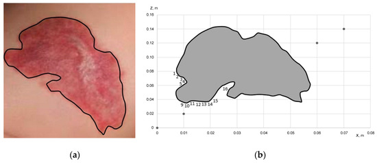 In the method of determining the indications for the treatment of hemangiomas in children [12], it is believed that hemangioma has a rounded shape. But this is not always the case (Figure 1). In general, hemangioma always has an irregular shape. Based on the results presented in previous works [10,11], the periphery of the hemangioma shown in Figure 1, left-hand side image, was partially approximated (concave part, points 1–5 Figure 2b and convex part, points 9–16) by polynomials of the third and fifth degrees, presented in Equations (1) and (2), respectively.