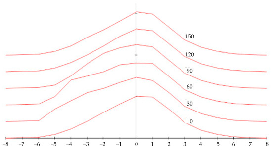 If the figure does not have sharp bends and depressions, then its three-dimensional shape can be recreated using radial sections. The corresponding sections can be obtained by taking photographs when rotating the figure at fixed angles. Depending on the optical properties (e.g., surface reflectivity and color) of the hemangioma, it is desirable to photograph the section on a contrasting background: a light background with a dark surface of the figure, or a dark background with the foreground of the figure illuminated. This will allow binary image processing to be applied to highlight the contour of the figure and determine the coordinates of the radial section. As a result, we have a set of data in a combined coordinate system for the specified angles of section θ: . The input data is a polar coordinate system in the plane of the base xy of the figure , and the output data is the height of the figure z. If the figure has an axis of symmetry, then it is convenient to place it at the origin of the plane xy. Therefore, the discrete coordinates r will have both positive and negative values relative to the axis of symmetry of the figure.