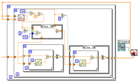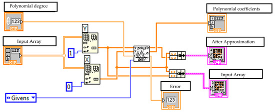 These data are then approximated using polynomial dependencies to achieve the best fit. A general polynomial is performed using the General Polynomial Fit VI, a standard function within the LabVIEW analysis library. This VI takes arrays of independent (X) and dependent (Y) data, along with a specified polynomial order, and returns the set of polynomial coefficients that best fits the data using a least-squares method. This VI was used to obtain the polynomial coefficients () for chosen polynomial order (N = 13). The choice of a 13th-order polynomial was determined empirically by evaluating a range of orders; this value was found to provide the optimal balance between accurately fitting the complex cross-sectional contour of our phantom model and avoiding the instability and overfitting that can occur with excessively high-order polynomials. A block diagram implementing polynomial approximation presented in Figure 7.