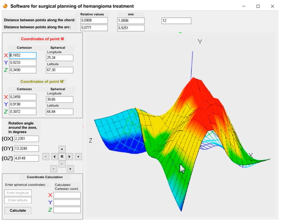 The method of determining the coordinates on the surface of the hemangioma model when point M passes into point M0 is visualized in Figure 3 and new coordinates recalculation is described by Equations (10) and (11).