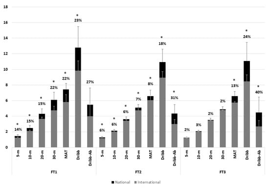 For FT3 players, only MAT and dribbling-related tests (but not linear sprints) showed significant differences between national and international players. The percentage differences and ES between groups showed that linear velocity seems to be more important in FT1 to discriminate between national and international players, while the dribbling (test and ability) seem to be the more differentiator factor for FT3, while sprint ability seem not to be as important in this sport class. This may be attributed to the higher functional capabilities of FT3 players, among whom performance differences in this ability are minimal (SD = 0.08 s in the 5 m sprint to 0.31 s in the 30 m sprint). The FT3 player—bearing in mind that only one is allowed on the field at any given time—is the player with the least activity limitations (i.e., the most functionally capable player) and typically assumes a more prominent role in the game. Although there are no qualitative studies available to validate this information, it is plausible that coaches demand more complex skills (e.g., dribbling or tactical ability) from FT3 players due to their greater influence on the game and the relatively small differences in sprint performance among eligible FT3 candidates. The higher importance of dribbling ability in this sport class (higher difference between groups compared to the other sport classes; Figure 1) suggests that technical proficiency could be a decisive factor in differentiating elite FT3 players, rather than pure speed or acceleration, which is in line with previous research []. However, the multiple discriminant analysis did not select any variable as predictor of players’ national–international selection. This may be due to the smaller sample size of this sports class, as well as the possibility that coaches consider other variables (not related to physical performance—such as perceptual skills, technical ability, or tactical knowledge) when selecting players. However, objectively measuring these technical and tactical skills presents a challenge, as coaches and scouts often rely on their “clinical eye” or expert knowledge []. Additionally, individuals with brain damage often develop other comorbidities beyond physical impairments, such as cognitive or sensory difficulties (e.g., intellectual, behavioral, visual, or auditory comorbidities) []. This may be a distinguishing factor in player selection, which has not been examined in the present study.