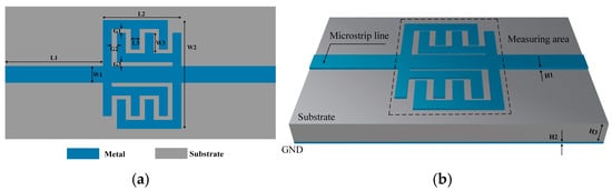 The configuration of the sensing probe is illustrated in Figure 1a. Its detailed dimensions are summarized in Table 1 below. The host part is a microstrip line, which is also used to connect the input/output ports, and this well-known simple structure facilitates connection to other planar microwave components. The probe’s sensing area is formed by two pairs of E-interdigital structures, which originally evolve from the interdigital capacitor. These structures are symmetrically arranged on either side of the microstrip line. This configuration has the potential to further enhance the confinement of the electric field. As illustrated in Figure 1b, the sensing probe is depicted in three dimensions. The metal is made of copper with a thickness of . The substrate is made of F4BM220 with a thickness of , where the and the . The relationship between and is as follows: