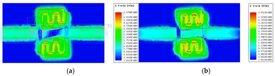 The electromagnetic simulation of the sensing probe was conducted utilizing HFSS 19.0 software. As shown in Figure 2, the reflection coefficient has two resonant frequency points, specifically, and . The generation of two resonant frequency points within the sensing area occurs simultaneously. Any environmental influence will induce equivalent changes at these two resonant frequency points, effectively mitigating the impact of environmental conditions. For instance, when the environmental temperature varies, the two resonant frequency points may shift. However, through differential operations, the adverse effects caused by this frequency shift can be effectively eliminated. As illustrated in Figure 3a,b, the distribution of the electric field for the sensing probe is demonstrated at two resonant frequency points, respectively. Figure 3 illustrates the electric field distribution on the sensing probe’s top metal structure. At , the electric field density is stronger at the fingertips of the E-interdigital structure; so, the capacitance effect seems to be more pronounced in this section. This finding suggests that the capacitance effect is more significant in this section, leading to the predominance of the effect in this region. At , the electric field at the fingertips is more concentrated than at , whilst there is also a significant enhancement in the electric field between the microstrip line and the E-interdigital structure. It is evident that an increase in the strength of the electric field confinement results in a corresponding enhancement in the sensitivity to the material.