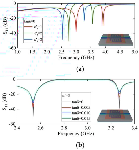 As illustrated in Figure 4, the simulation outcome demonstrates the reflection coefficient of the sensing probe when subjected to a range of solid materials. The size of the solid sample is designated as , ensuring that its surface area exceeds that of the sensing area of the probe. This design guarantees full coverage of the sensing area. Furthermore, the center of the solid material aligns with the center of the sensing area, and it is uniformly affixed to the sensing probe from both the left and right sides. As long as the solid material can cover the sensing area, variations in the area of the solid material will not impact the resonant frequency point. However, changes in the solid material thickness will alter the electromagnetic field distribution within the sensing area, necessitating a re-fitting process. In Figure 4a, when the , both resonant frequency points decrease as the increases. In Figure 4b, when the , the two resonant frequency points do not shift but the peak attenuation decreases as the increases. Therefore, the complex dielectric constant of the material can be extracted from the changes in the resonant frequency and the peak attenuation of the sensing probe.