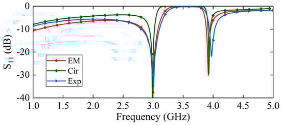 The equivalent circuit model of the sensing probe is shown in Figure 5. The input and output of the microstrip lines are simulated by these two sets of inductors and capacitors . The resonant circuit formed by two pairs of E-interdigital structures and the ground is represented by two sets of series inductors and capacitors . A parallel resonant loop consisting of inductor and capacitor is used to simulate the mutual coupling effect between the E-interdigital structures. The parameters of the equivalent circuit model are , , , , , . Placing the solid material to be measured above the sensing area changes the effective complex dielectric constant of the system, which is reflected in the equivalent circuit by changing the values of the parameters of the series resonance loop. The greater the complex dielectric constant of the solid material, the greater the value of and . As illustrated in Figure 6, a comparison is made between electromagnetic field simulation, circuit simulation and experimental testing under no-load conditions. It is evident that the three methods demonstrate a satisfactory degree of consistency.