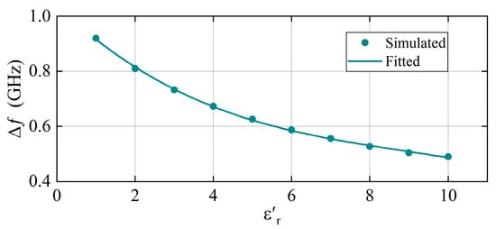 where the fit correlation of the curve reached 0.9993. Figure 7 shows that decreases with an increase in the dielectric constant. This indicates that the resolution will decrease when testing materials with high dielectric constants. However, within the testing range where , can still maintain a value above 0.5 GHz, suggesting that the overall resolution remains relatively high.