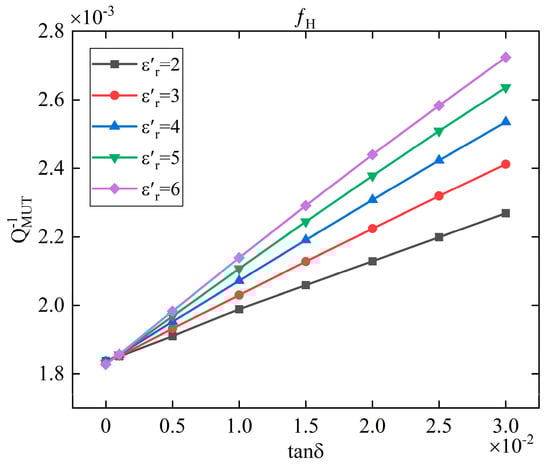 In comparison with low-frequency resonant points, high-frequency resonant points exhibit superior electric field concentration capabilities and heightened sensitivity to alterations in material parameters. Consequently, the high-frequency resonant points are selected for the calculation of loss tangent. It can be seen in the simulation results of Figure 4b that when the is constant, the variation in the affects the peak attenuation. The variation in the peak attenuation affects the quality factor of the measurement system, which is given by the following equation: