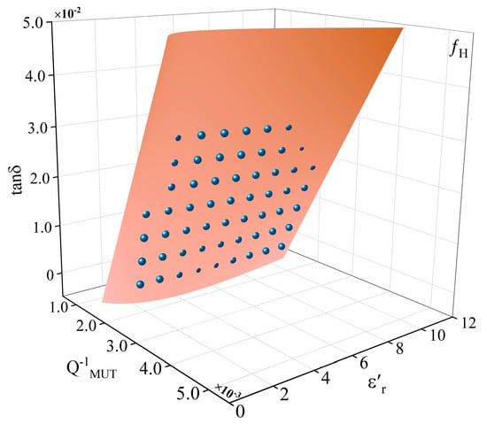 Figure 8 shows the relationship between and at different . It can be seen that the relationship between and is linear, but the linear ratio is different when the is different. In order to fit the three interrelated parameters together, in this paper, a three-dimensional rectangular coordinate system is set up and the Rational Taylor model is selected to fit the parameters, as shown in Figure 9. The model uses a combination of rational Bezier curves and Taylor series to represent the surface, which has the advantage of being more flexible in representing the local geometry of the surface, allowing for a better approximation of very complex geometries. The ability to fine-tune the local geometry at any point on the surface through the Taylor series makes the Rational Taylor surface model ideal for applications requiring high precision control. As the model requires the computation of Taylor series, this is more demanding on computational resources. However, for the fitting scenarios in this paper, the effect of computational complexity is negligible. The loss tangent can be calculated by: