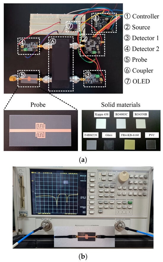 A prototype of the sensor system is shown in Figure 11a; it can independently complete the measurement of the complex dielectric constant of solid materials. The sensing probe is fabricated on F4BM220 substrate, with and . The selected connector type is SMA-KE-0.8MM. One end is connected to the sensing probe using a side-insertion method, while the other end is connected to the broadband coupler through a threaded insertion method. The size of solid materials is , which is larger than the sensing area; therefore, it completely covers the surface of the sensing area of the probe. These solid materials are all frequency-stable, indicating that their dielectric constant remains unchanged across varying frequencies. Since the sensor system cannot directly display the entire measurement process of the frequency band, a VNA is used for auxiliary measurement verification. In Figure 11b, the VNA is Agilent 8720ET and is calibrated using the SOLT method. After calibrating the sensor system, the reflection coefficient of the probe is first measured unloaded and compared with the simulation results to verify the validity of the sensors. The experimental results are shown in Figure 6, where a slight shift in the resonant frequency is observed due to a fabrication error.