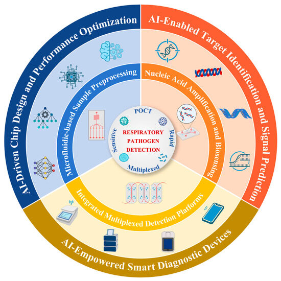 In recent years, the deep integration of Artificial Intelligence (AI), especially Machine Learning (ML) and Deep Learning (DL), with microfluidics has opened up new opportunities to address the above challenges and revolutionize the paradigm of respiratory pathogens detection (Figure 1). AI is able to optimize the hydrodynamic design and structure of microfluidic chips through data-driven modeling; empower intelligent pre-processing and target enrichment of complex samples; enhance the performance and reliability of platforms for highly sensitive detection based on nucleic acid amplification (e.g., digital PCR, LAMP, CRISPR) and biosensing (e.g., antigen–antibody, nucleic acid hybridization) high sensitivity assay platforms with high performance and reliability; enable intelligent analysis and interpretation of signals in high throughput multiplexed assays; and drive the development of portable, smartphone-integrated, POCT systems [33,34,35,36,37,38,39,40,41,42,43]. This synergistic effect is driving the birth of smarter and more powerful fully integrated microfluidic detection systems.