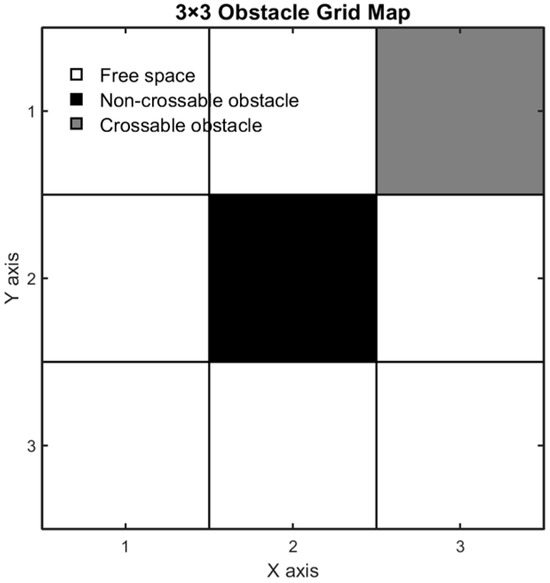 This experiment was implemented in MATLAB 2022a under the hardware environment of a Windows 11 system, a 3.20 GHz AMD Ryzen 7 6800 H CPU, and 16 GB of RAM. A 40 × 40 grid map was constructed and static black insurmountable obstacles and gray surmountable obstacles were randomly generated.