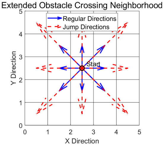 The extended neighborhood includes eight standard moves and eight “jump” moves. A jump allows the robot to move over a single grid cell to land two cells away, horizontally, vertically, or diagonally. To ensure physical feasibility and to avoid collisions, every potential jump was evaluated against a strict set of rules: let the robot’s current node be at coordinates (x, y), then the validity of a jump depends on the status of the intermediate cell being jumped over and landing cell.