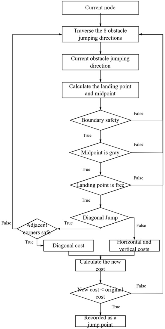Step 5: If all checks for a jump direction are passed, calculate the cost of this move. If this new path to the landing node is cheaper than any existing path, it is recorded as a potential jump point and the node’s cost is updated. Otherwise, return to Step 1.