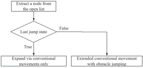 To address the potential for the continuous jumping introduced by the dynamic weighting discussed in the previous section, a state-driven continuous obstacle crossing constraint mechanism was embedded in the improved A* algorithm to ensure the robot’s motion stability. When the robot reaches a new target point through obstacle crossing, the node is marked as the last jump. If it is false, the next step is to perform expansion in the conventional and obstacle crossing directions; if it is true, the next step is restricted to conventional movement only. This mechanism constrains the continuous obstacle crossing action. Figure 4 presents the flowchart.