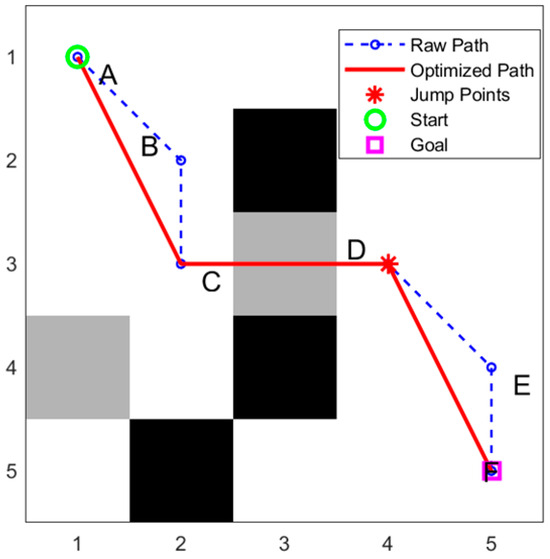 In path planning algorithms, particularly when applying the A* algorithm to path search tasks, the generated path may contain redundant nodes. To improve path quality while ensuring path feasibility and obstacle avoidance, the algorithm prunes redundant nodes with the aim of replacing multiple line segments with a single line segment whenever possible. The algorithm specifically considers the “jump points” defined in this study, marking all nodes involved in the jumps or obstacles as essential points to ensure that these actions are not removed during optimization. The core concept of the algorithm is as follows: