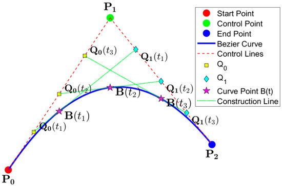 where B(t) is the curve trajectory function, n defines the curve’s degree, Pi represents the control point, and t is a parameter. This study employed a second-order Bézier curve to enhance the path smoothness. Below is the form of the second-order Bezier curve: