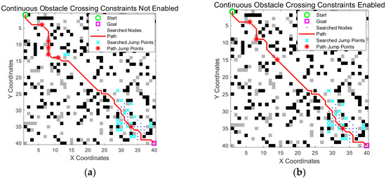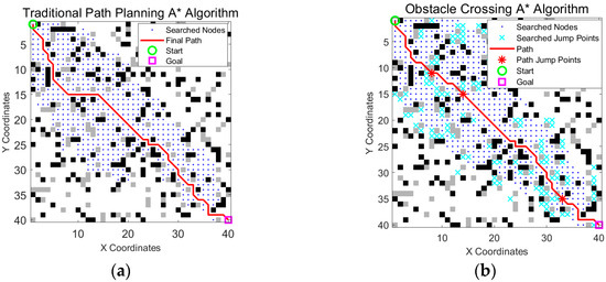 Verification of the continuous obstacle crossing constraint mechanism. (a) Without the constraint mechanism, the path exhibited multiple consecutive obstacle crossing actions, which may lead to instability; (b) with the constraint enabled, consecutive crossings were limited, resulting in more controlled and safer navigation. The green circle is the start point, the magenta square is the goal point, blue dots indicate searched nodes, cyan crosses represent all explored jump points, the solid red line is the optimized path, and the red stars on the path mark actual jump points.