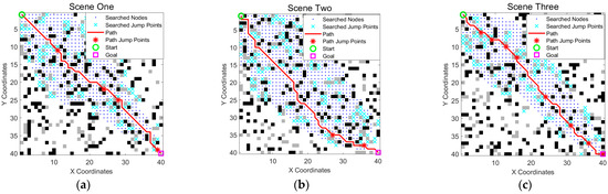 Effects of the obstacle crossing A* algorithm in different scenarios. (a–c) represent three different obstacle scenarios, respectively. The green circle is the start point, the magenta square is the goal point, blue dots indicate searched nodes, cyan crosses represent all explored jump points, the solid red line is the optimized path, and the red stars on the path mark actual jump points.