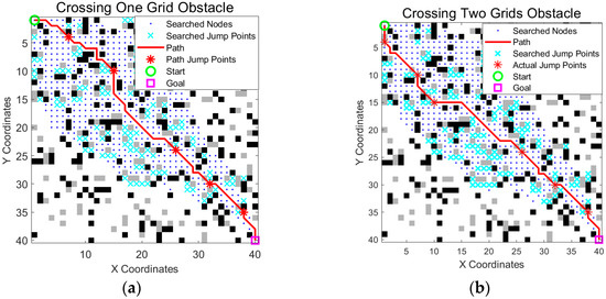 Comparison of the crossing one obstacle and crossing two obstacles scenarios. (a) Crossing a single obstacle cell in a horizontal, vertical, or diagonal direction; (b) crossing two consecutive obstacle cells in a horizontal, vertical, or diagonal direction. The green circle is the start point, the magenta square is the goal point, blue dots indicate searched nodes, cyan crosses represent all explored jump points, the solid red line is the optimized path, and the red stars on the path mark actual jump points.