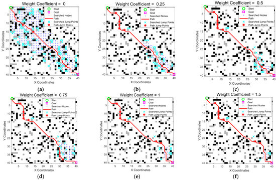 Path comparison under different weight coefficients. (a) With α = 0, the search covered a wide area. (b–f) As α increased, the search range was significantly reduced, resulting in a more focused and goal-directed path. The green circle is the start point, the magenta square is the goal point, blue dots indicate searched nodes, cyan crosses represent all explored jump points, the solid red line is the optimized path, and the red stars on the path mark actual jump points.