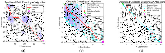 Algorithm path in a 40 × 40 map. (a) The traditional A* algorithm generated a path that avoided obstacles but tended to be longer and less smooth; (b) the obstacle crossing A* algorithm reduced path length by allowing jumps over gray obstacles; and (c) the optimized A* algorithm improved path continuity and smoothness, enabling more efficient robot traversal. The green circle is the start point, the magenta square is the goal point, blue dots indicate searched nodes, cyan crosses represent all explored jump points, the cyan line shows the optimized final path, and the red stars on the path mark actual jump points.