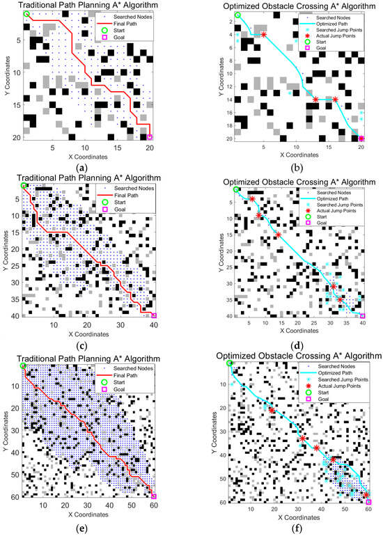 Comparison of the traditional A* algorithm and the obstacle crossing A* algorithm in this paper used on different map sizes: (a,b) are for 20 × 20 maps, (c,d) are for 40 × 40 maps, and (e,f) are for 60 × 60 maps. The green circle is the start point, the magenta square is the goal point, blue dots indicate searched nodes, cyan crosses represent all explored jump points, the cyan line shows the optimized final path, and the red stars on the path mark actual jump points.