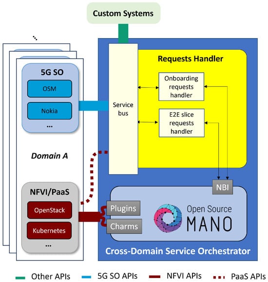 To bridge this gap, a Requests Handler module is designed on top of OSM to handle the necessary integrations, specifically to translate/forward the different requests from any Custom System northbound (e.g., at the OSS/BSS level) towards the CDSO’s OSM instance and towards the domains’ 5G SOs. The Requests Handler seeks to be the main integration point that facilitates interworking among independently orchestrated 5G domains.