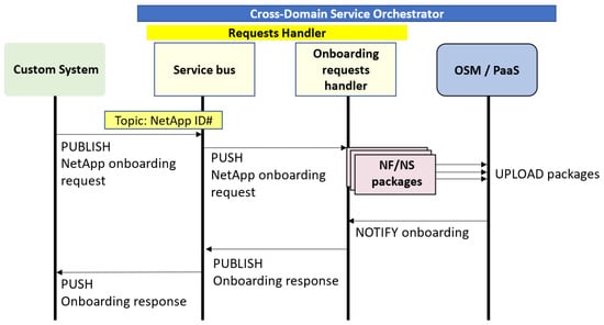 With this in mind, a CDSO based on ETSI’s Open Source MANO (OSM) [] is presented in this paper. The CDSO internal architecture is presented with a Requests Handler module on top of the OSM, which is designed as the main integration point in relation to the different components of the E2E chain. Additionally, workflows for (i) NetApp onboarding and (ii) E2E slice ordering are illustrated and described. Though originally proposed under the framework of 5GMediaHUB [], the approach is expected to go beyond the project, i.e., any Custom System northbound can be integrated into the CDSO, and benefit from a multi-domain platform. The 5GMediaHUB use case is presented as a proof-of-concept, with a first implementation of the Requests Handler and the NetApp onboarding workflow. In this case, the Custom System is 5GMediaHUB’s Experimentation Tools layer, which enable developers to design, onboard, and test media NetApps and next-generation scenarios.