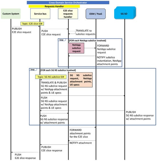 Based on the required NetApp(s) and location information from the UE specification, the E2E slice Requests Handler generates the corresponding NetApp subslice request(s), tagged with the VIM/CISM target(s) and SLSs. This is then forwarded to the CDSO’s OSM instance for instantiation. Once the NetApp(s) has/have been successfully instantiated, the E2E slice Requests Handler obtains the NetApp(s) attachment points among NetApp subslices relating to the 5G NSs. The E2E slice Requests Handler then generates the required 5G NS subslice request(s), which translates a domain-specific UE subspecification and indicates the NetApp(s) attachment points. Next, we publish the request(s) to the Service bus with their respective 5G NS subslice ID#; then, we push them to the 5G SO(s) of the involved domain(s). Once the 5G NS(s) has/have been successfully instantiated, the 5G SO(s) will publish the response(s) to the Service bus, as well as indicating the 5G NS(s) attachment points in relation to the NetApp subslices. The Service bus will push them to the E2E slice Requests Handler. The latter will consolidate the attachment points information for the E2E slice and forward it to the CDSO’s OSM instance for configuration.