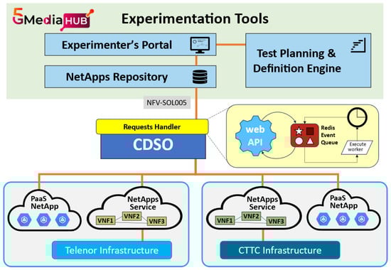 In this section, 5GMediaHUB’s Experimentation Tools layer is first described, which acts as the Custom System, followed by the current CDSO Requests Handler implementation and its integration with the NetApps Repository. An illustrative overview of the 5G-MediaHUB use case is presented in Figure 5.